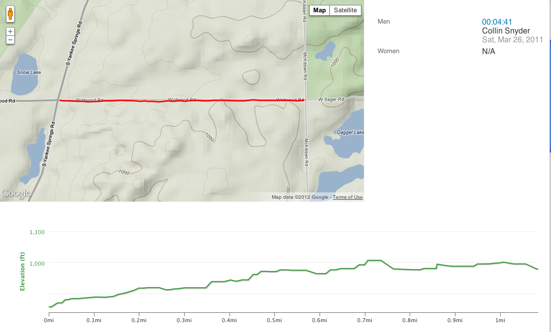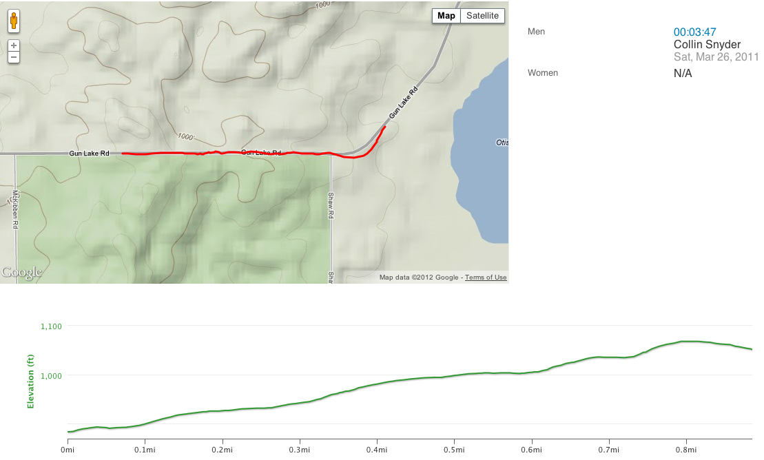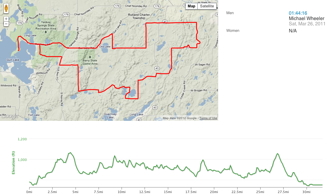 With the new Shaw Road section this year, the base of the last big climb is clipped, but you’ll still get a solid race and a steep section of the final test before the sprint. The Gun Lake Climb is on pavement, but comes with some seriously hard miles already in the legs and the beginnings of late-race shenanigans. This year, riders will just have turned off of Shaw Road, making this climb a bittersweet relief: it’s pavement, sure, but the road turns immediately up. A headwind here could somewhat negate the hill’s selectiveness, but after this much racing, there’s no way to tell how it will hurt riders. It’s the only climb where cyclocross bikes will have a distinct advantage over fatter tires. Last year, more than a few riders said the decision to go with 1.95″ tires on a 29er was worth it for this climb alone, and the skinnier CXers will benefit even more. At .9 miles long with a 3.3% gradient, Gun Lake brings riders up 183 feet. It was last year’s (and should be this year’s, too) cima coppi, or highest point in the race at about 1,055 feet above sea level. It’s summit comes at 27 miles, and it’s is almost entirely downhill for the remainder of the race. For MTBers, it’s best to drop the CXers before the pavement and hope they don’t catch you…here’s to dreaming.