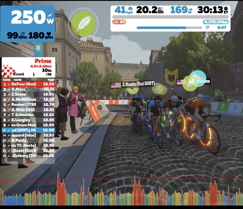In a Zwiftied version of the track event, the Madison was all about Team points. No GC time, no sprint or KOM points, just a chance to shake up the squad standings. A simple premise; see how many laps each rider from each team could rack up in 40 minutes. Stay on the lead lap, good. Keep your whole team on the lead lap….even better.